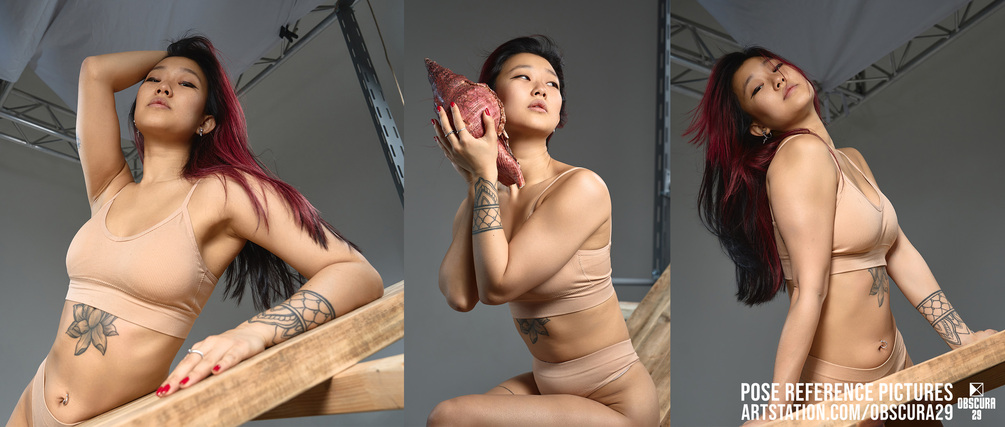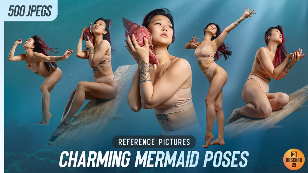 Dive into a fantasy ocean with our mesmerizing '500 Charming Mermaid Poses' reference picture pack! It contains 500 high-res images of a beautiful girl portraying a mermaid in graceful, relaxed, and alluring poses. The thematic props, such as a shipboard and a delicate seashell, add authenticity to these pictures.